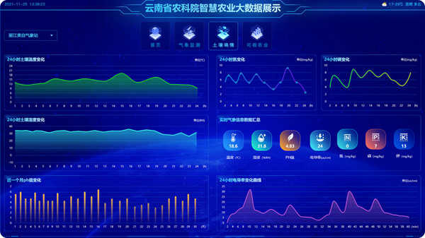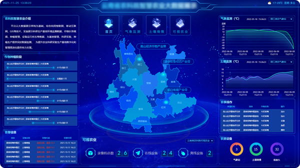 系统可视化分析了各基地传感器传输而来的环境监测数据,以数据图表、曲线图等形式分析展示,为农事决策提供依据。集成展示了设施基地、有机基地、双减基地、益农信息社等产业基地的分布情况,如点击阜宁稻麦示范基地这个点,可以查看基地的介绍、实时监控的视频、环境分析数据。